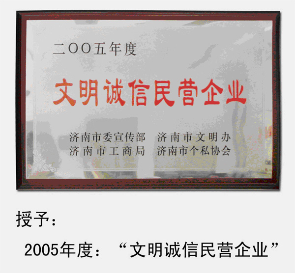 2005~2010年,被濟(jì)南市委宣傳部、濟(jì)南市文明辦、濟(jì)南市工商局、濟(jì)南市個(gè)私協(xié)會(huì)評(píng)為“文明誠(chéng)信民營(yíng)企業(yè)”